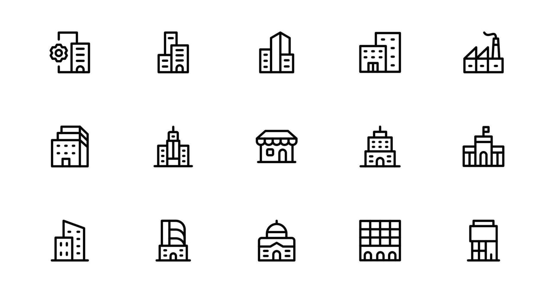 Building Icon Set Representing Construction, Architecture, Tools, Blueprints, and Urban Development in Simple, Download-Ready Pro Vector