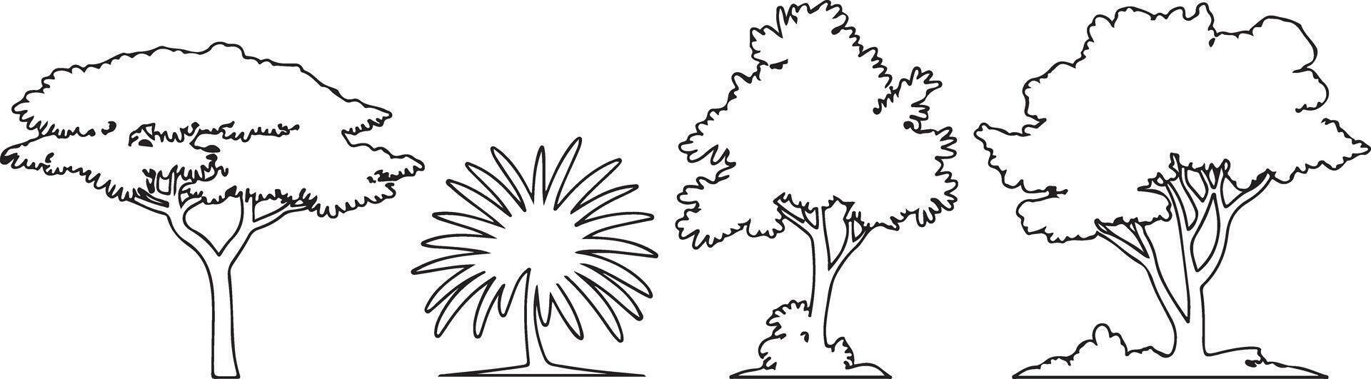 Black and White Line Drawing Set of Four Trees Side View Umbrella Tree Palm Tree and Two Deciduous Trees Simple Nature Illustration Pro Vector
