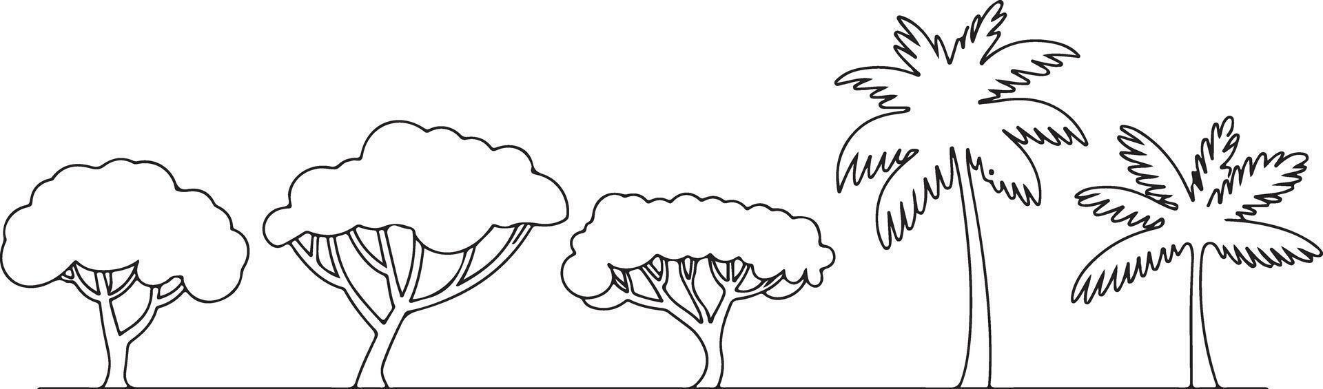 Simple Line Drawing of Trees Side View Minimalist Black and White Illustration of Deciduous and Palm Trees Landscape Design Element Pro Vector