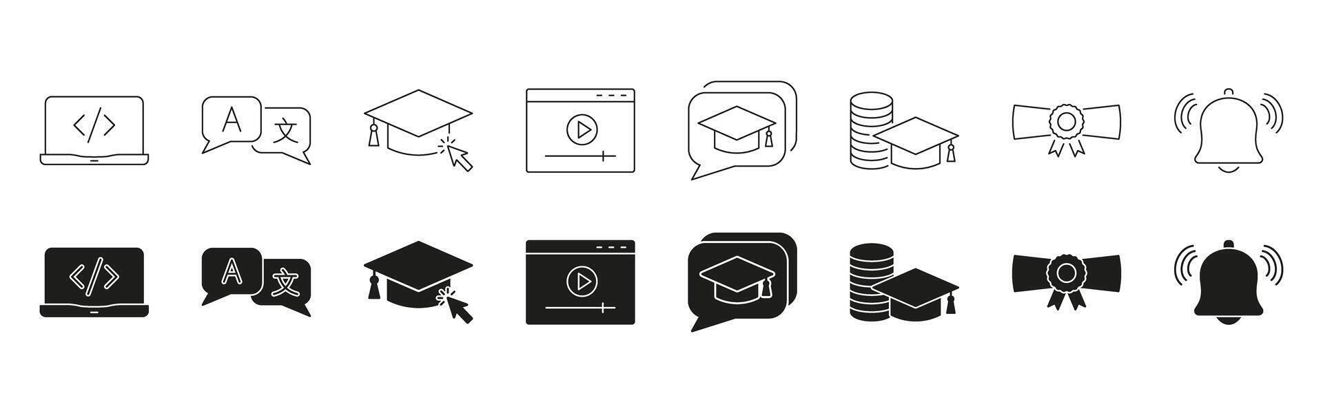 Online Education And Learning Icon Set. E-Learning, Language Translation, And Certification Symbol Collection. Digital Courses And Notifications. Isolated Illustration Pro Vector