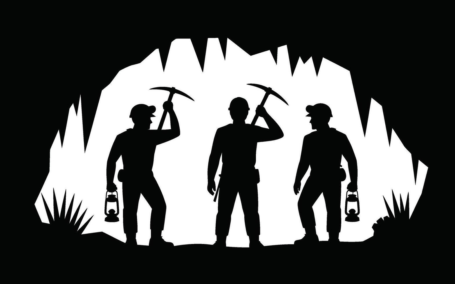 Silhouetted Miners with Pickaxes and Lanterns in a Cave Pro Vector