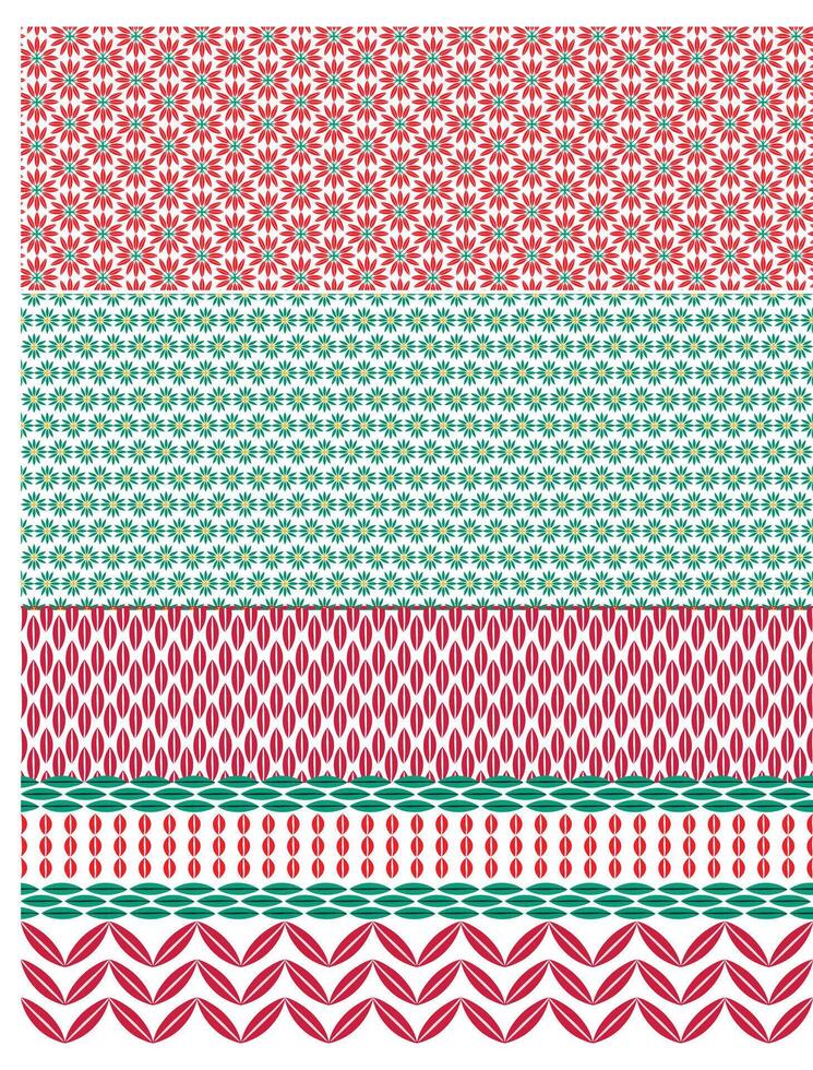 A pattern alternating rows of red and green floral designs, geometric shapes, and scalloped edges Pro Vector