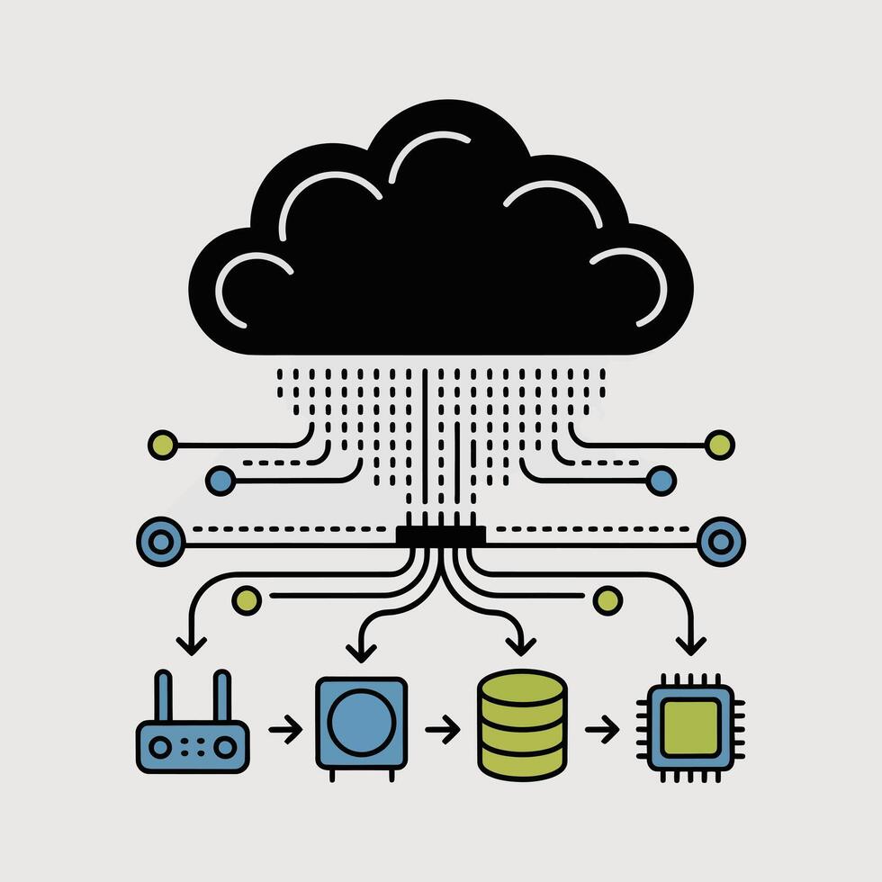 Teal Olive Green Black Cloud Data Transfer Diagram Illustrating Network Connections to Router Server Database and Microchip Data Flow vector