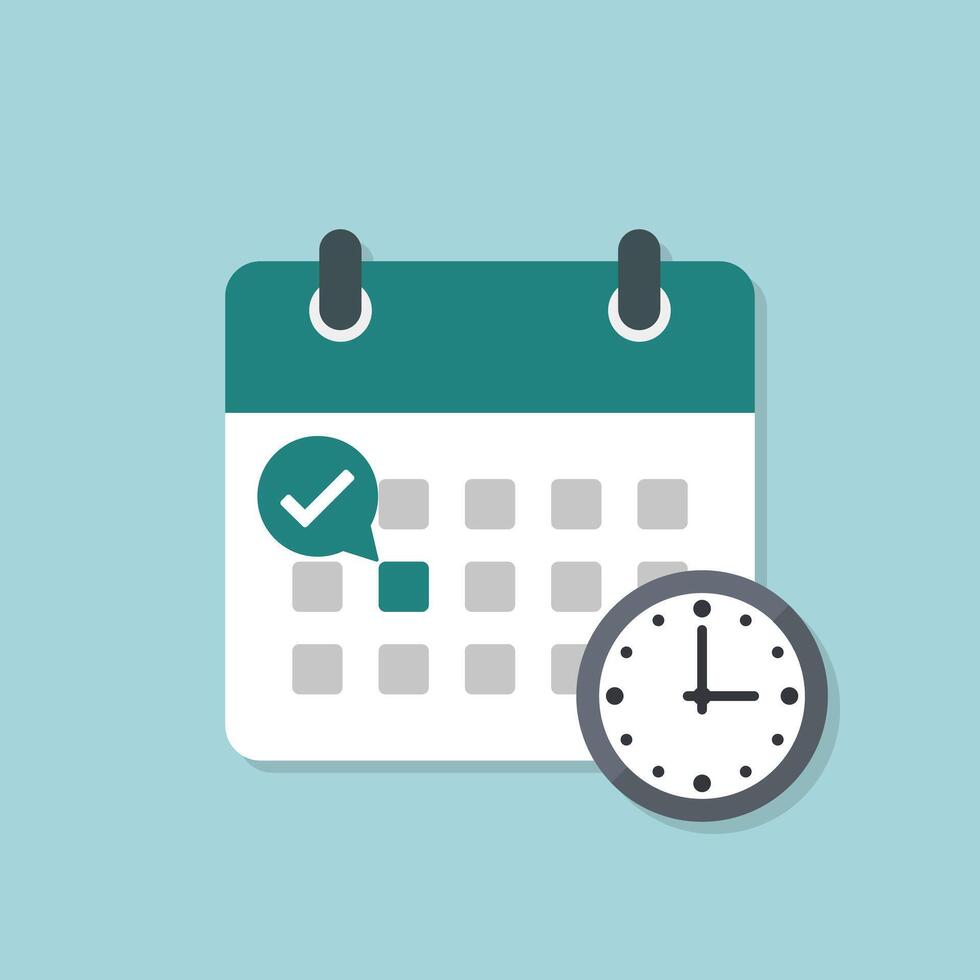 Calendar with clock and check mark, calendar flat icon illustration. Tick mark deadline, highlight date, event calendar reminder, business meeting schedule, appointment done, agenda planner. Pro Vector