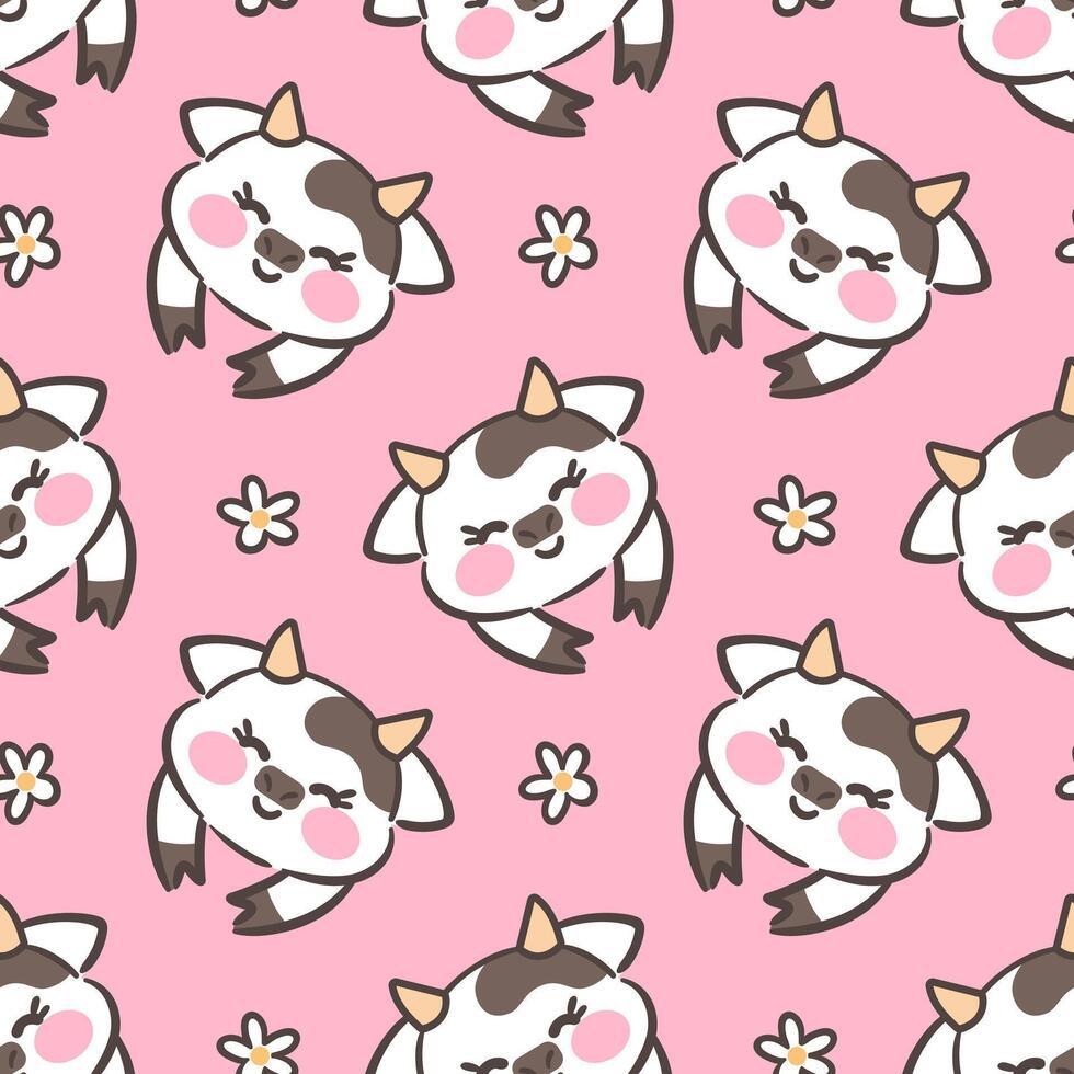 A seamless pattern featuring cute kawaii cows surrounded by flowers. The playful design showcases the cows with adorable expressions, creating a cheerful and whimsical atmosphere Pro Vector