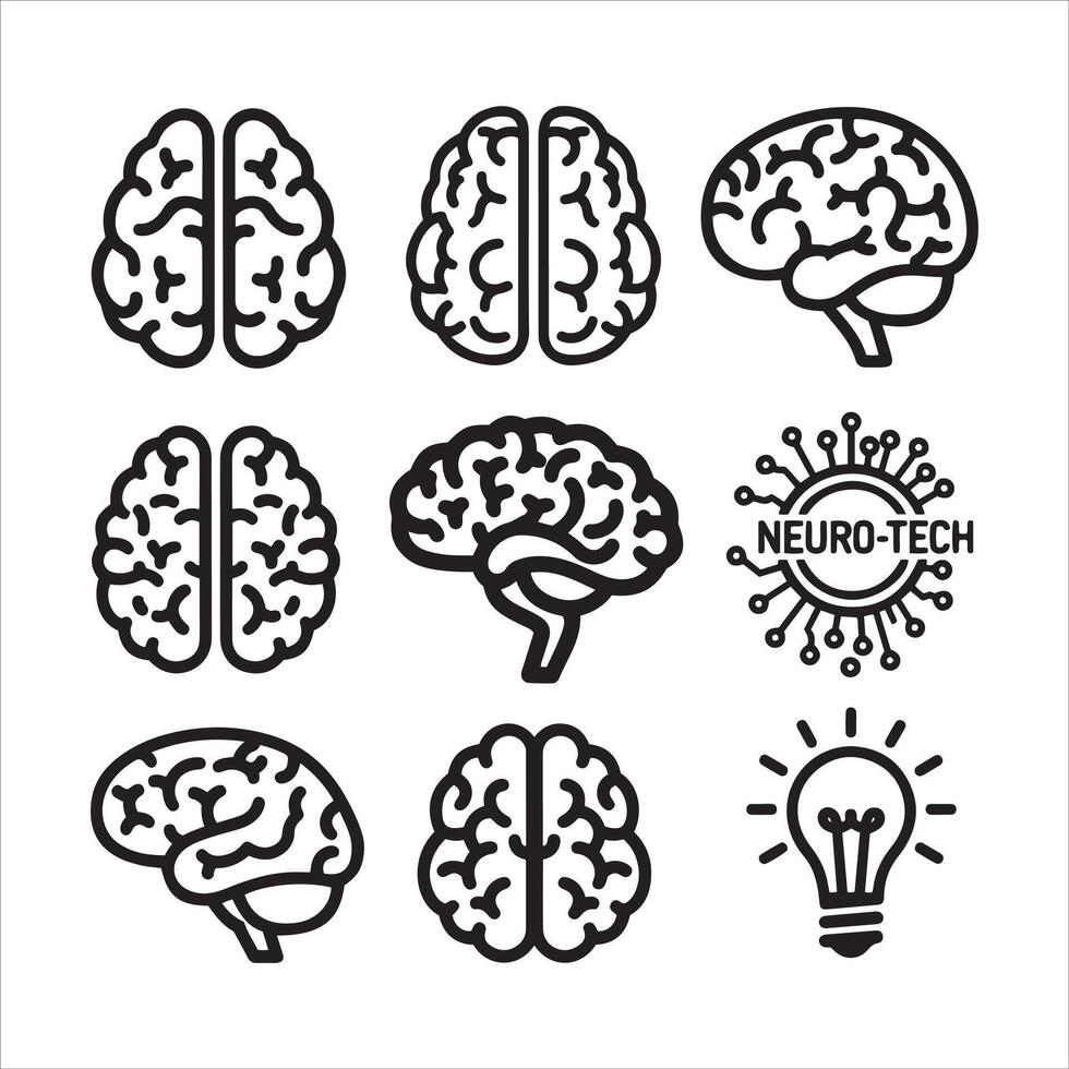 Collection of stylized brain graphics and neural network symbol Pro Vector