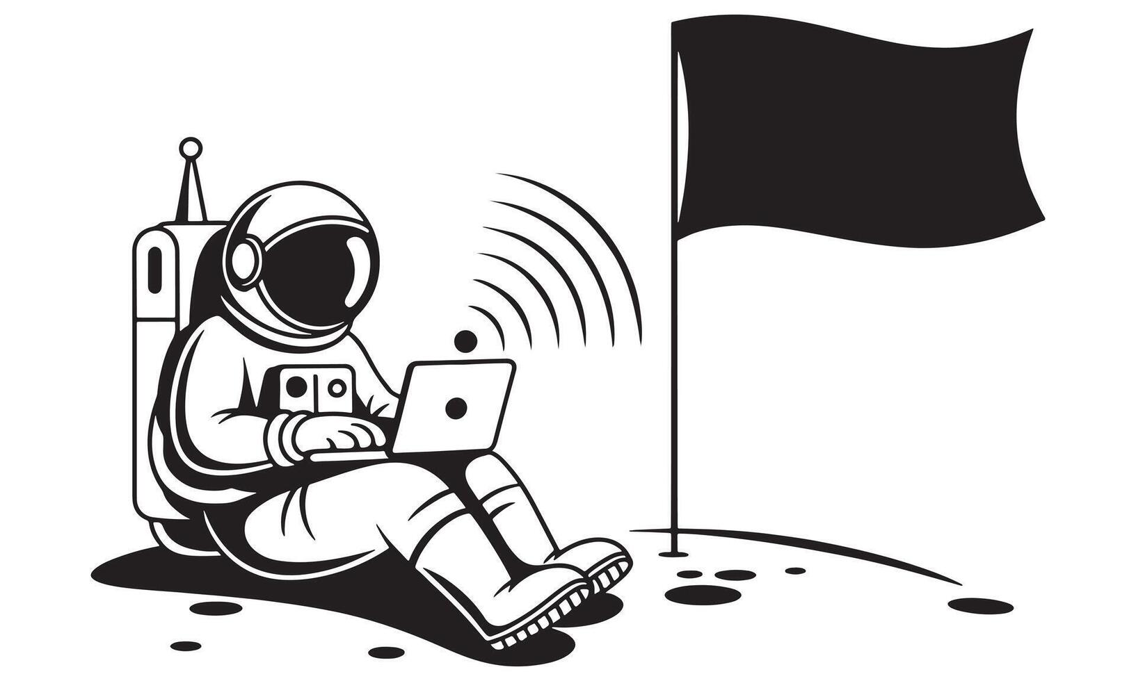 Astronaut sitting on lunar surface using laptop with wifi signal and flag space moon Free Vector