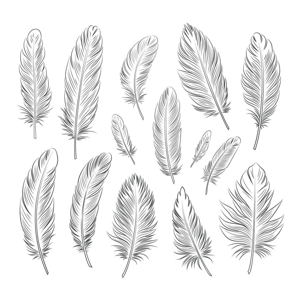 Large set of bird feathers of different shapes and sizes. Linear graphics. Pro Vector