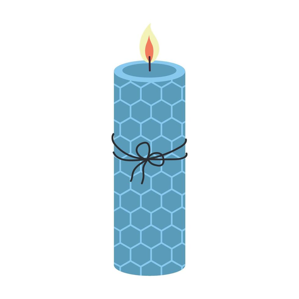 Tall blue candle with honeycomb hexagon pattern, black string bow, and lit flame in modern style Pro Vector