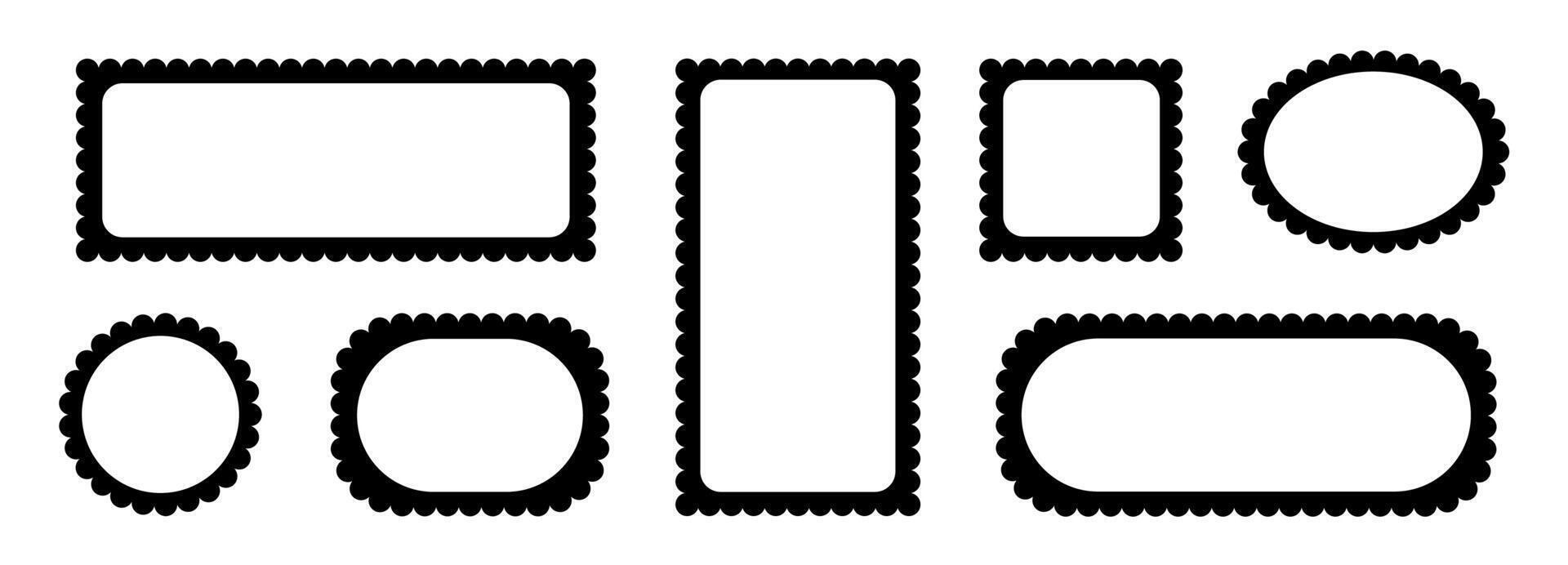 Border frame scallop edge rectangle, oval, round shape. Wave scallop squiggle cute simple rectangle border set. Simple wavy squiggly line retro photo picture frames Pro Vector