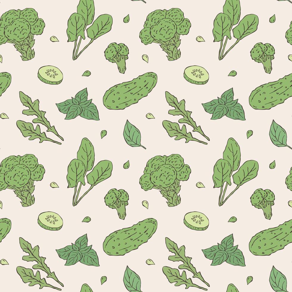 Seamless pattern featuring hand drawn illustrations of broccoli, spinach, arugula, cucumber, and basil in a minimalist doodle style Pro Vector