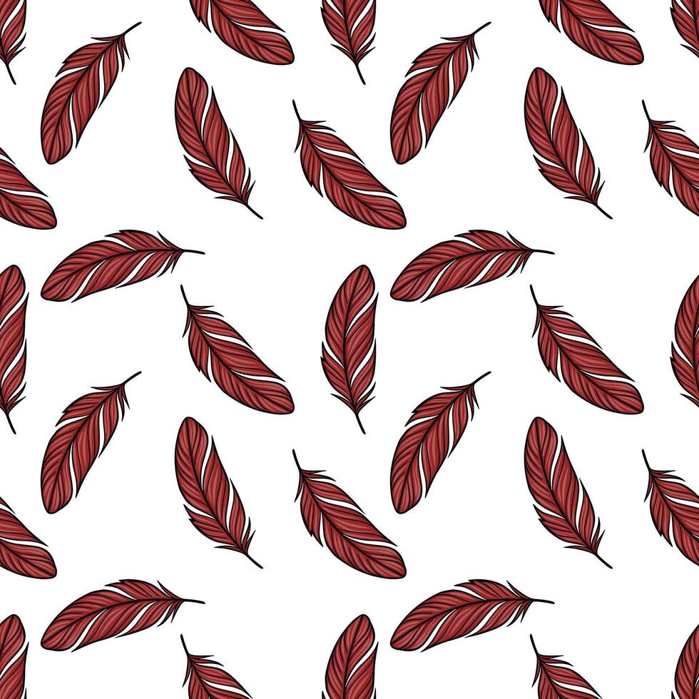 Seamless pattern with scattered dark red feathers on a white background, creating a stylish and elegant design. Pro Vector