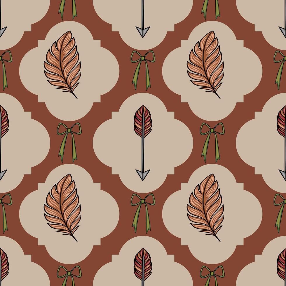 Seamless pattern with stylized feathers, arrows, and bows in terracotta and beige tones, arranged in a repeating geometric design. Pro Vector