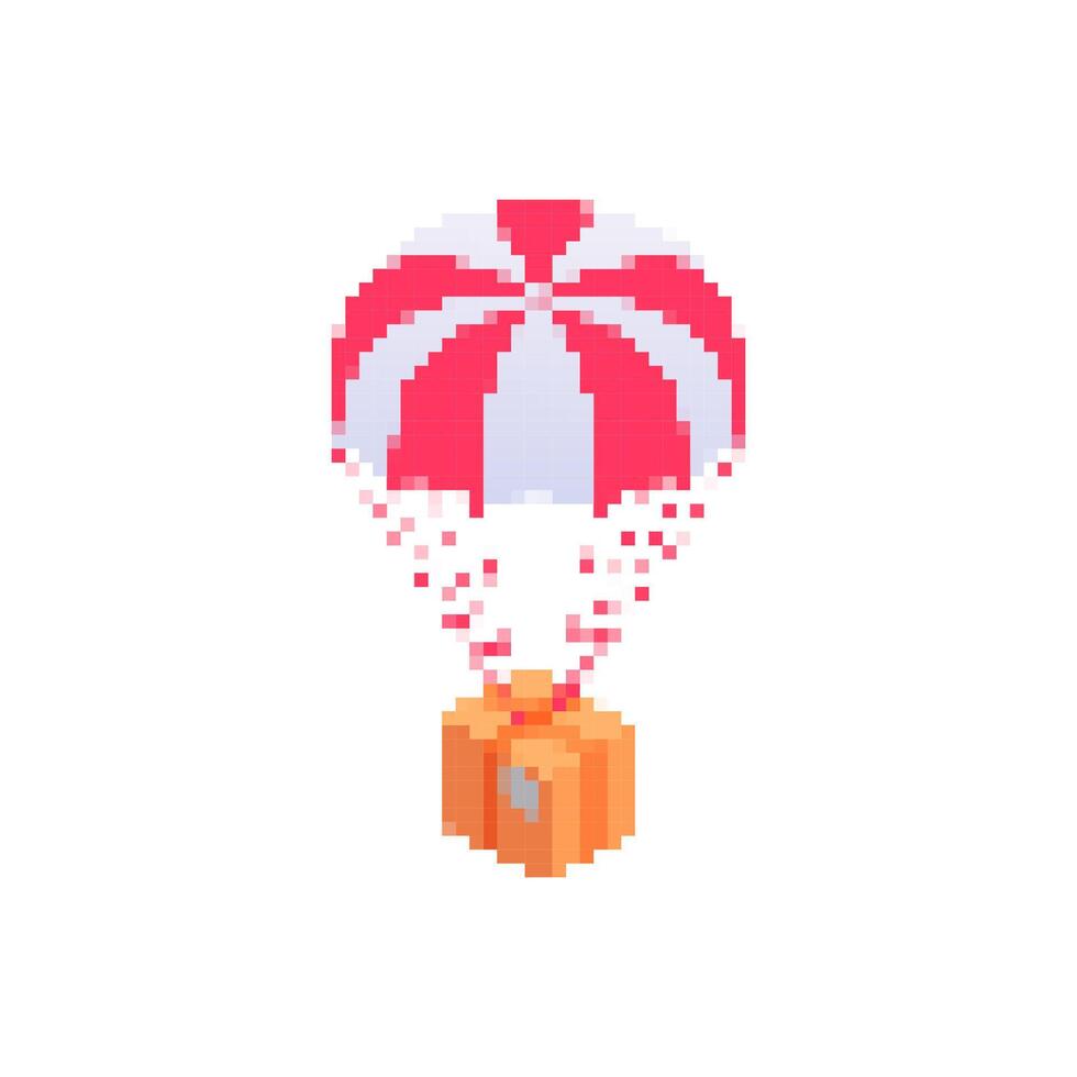 Mosaic pixelated parachute with stripe design and attached box in retro style icon Pro Vector