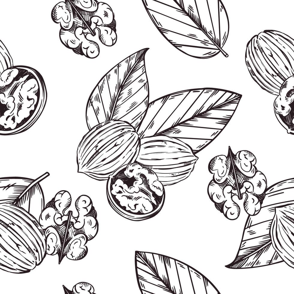 Seamless pattern of walnut, walnut leaves, peeled walnut. All objects are hand-drawn with ink. Illustration suitable for printing on wrapping paper, product packaging Pro Vector