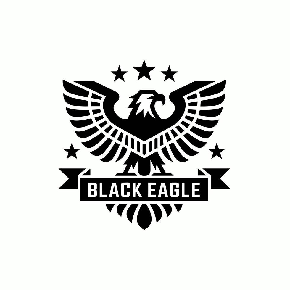 A Dynamic Black Eagle Emblem with Geometric Patterns and Stars, within a Rectangle Frame, on a White Background Pro Vector