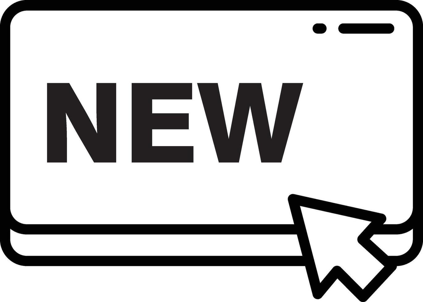 New label icon, black outline style, with computer screen and cursor arrow, representing update, innovation, or announcement in digital technology, modern and minimalistic design vector