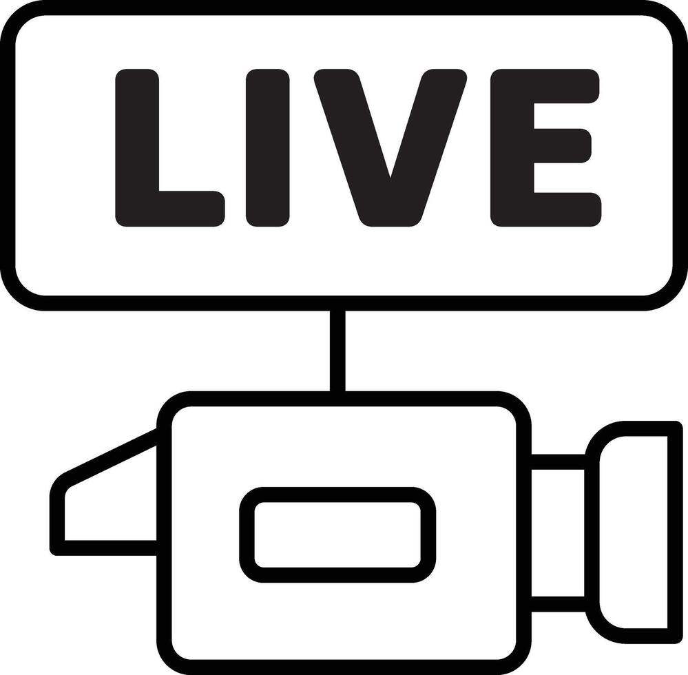 Live broadcast camera icon, black outline style, features camera with rectangular LIVE sign above, symbolizing real time streaming or online content creation vector