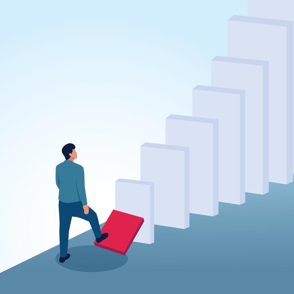 A man steps on the first domino effect. A metaphorical illustration of the first step, starting and the starting line in business. Pro Vector