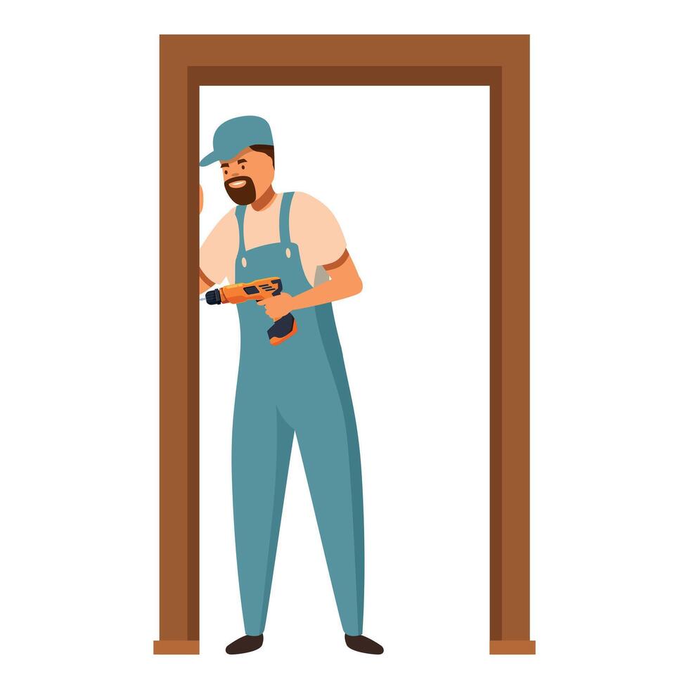 Carpenter installing door frame using cordless drill, home renovation project Pro Vector