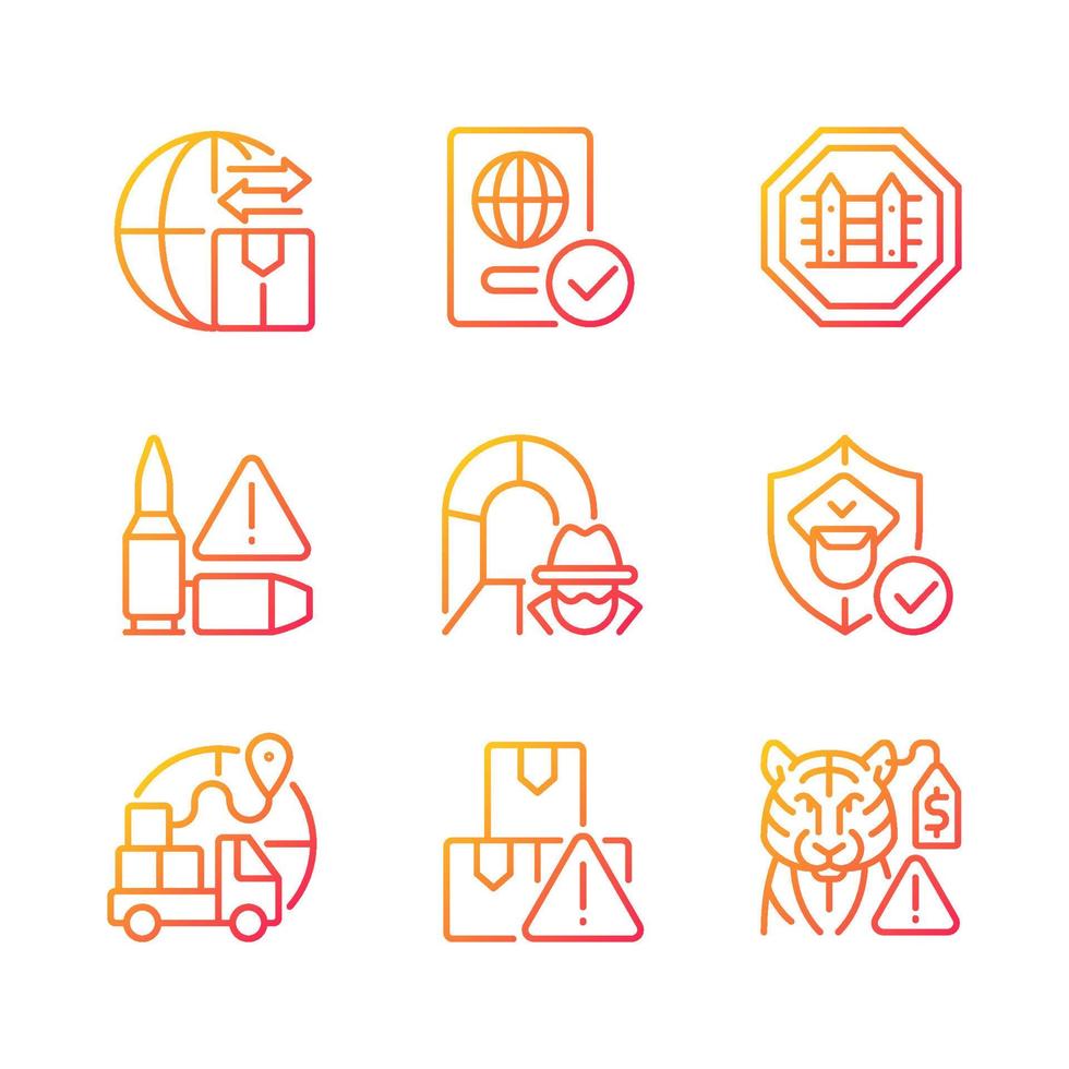 International trading gradient linear vector icons set. Customs officer. Smuggling tunnel. Border security. Thin line contour symbols bundle. Isolated outline illustrations collection Pro Vector and Pro SVG