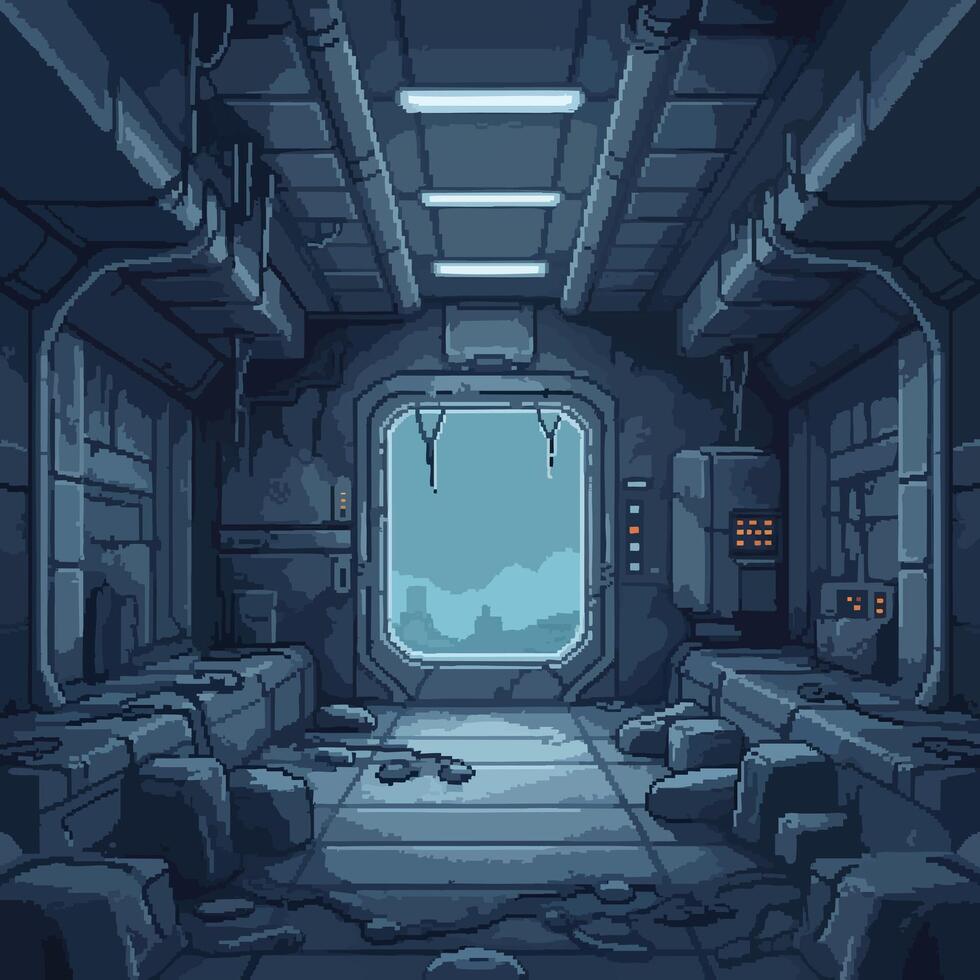 Derelict futuristic hallway in pixel art style with debris and a large window view. Pro Vector