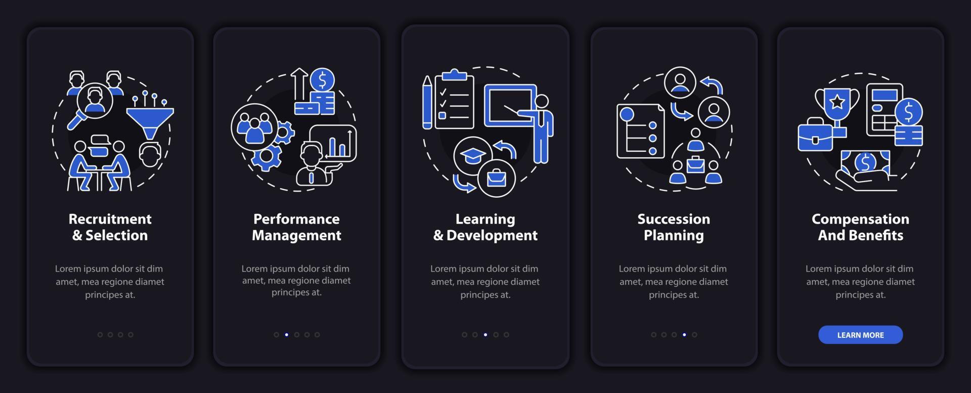 HR management basics night mode onboarding mobile app screen. Walkthrough 5 steps graphic instructions pages with linear concepts. UI, UX, GUI template. Myriad Pro-Bold, Regular fonts used Pro Vector