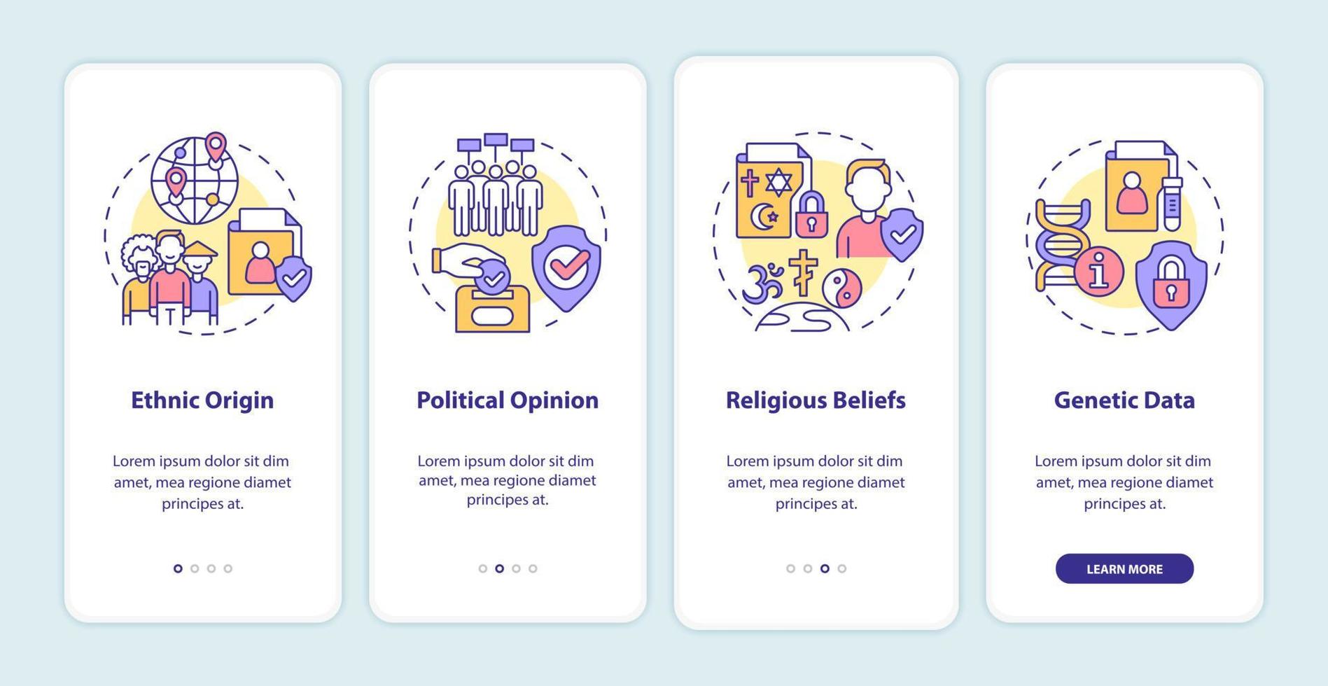 Examples of personal information onboarding mobile app screen. Protection walkthrough 4 steps graphic instructions pages with linear concepts. UI, UX, GUI template. Myriad Pro-Bold, Regular fonts used Pro Vector