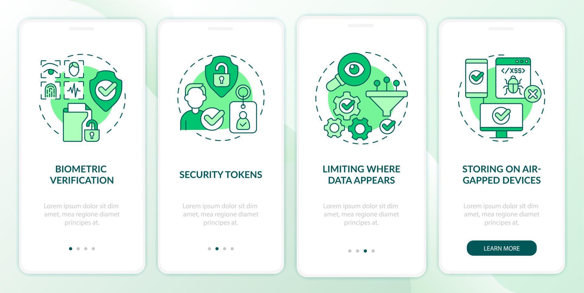 Confidentiality countermeasures green onboarding mobile app screen. Safe walkthrough 4 steps graphic instructions pages with linear concepts. UI, UX, GUI template. Myriad Pro-Bold, Regular fonts used Pro Vector