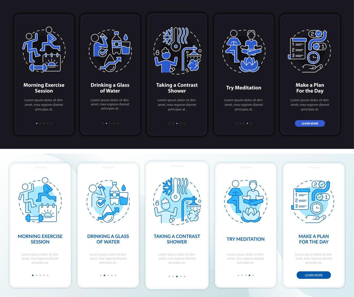 Daily routine night and day mode onboarding mobile app screen. Wellness walkthrough 5 steps graphic instructions pages with linear concepts. UI, UX, GUI template. Myriad Pro-Bold, Regular fonts used Pro Vector