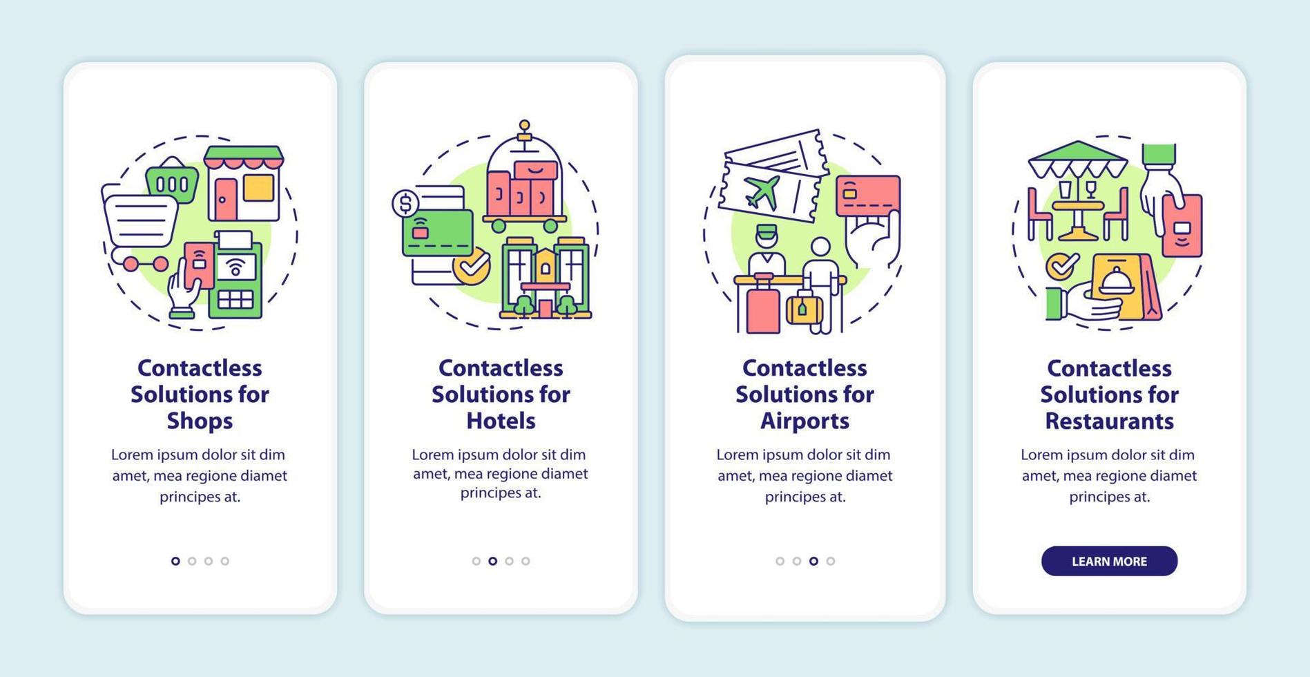Contactless solution for public place onboarding mobile app screen. Service walkthrough 4 step graphic instructions pages with linear concept. UI, UX, GUI template. Myriad Pro-Bold, Regular fonts used Pro Vector