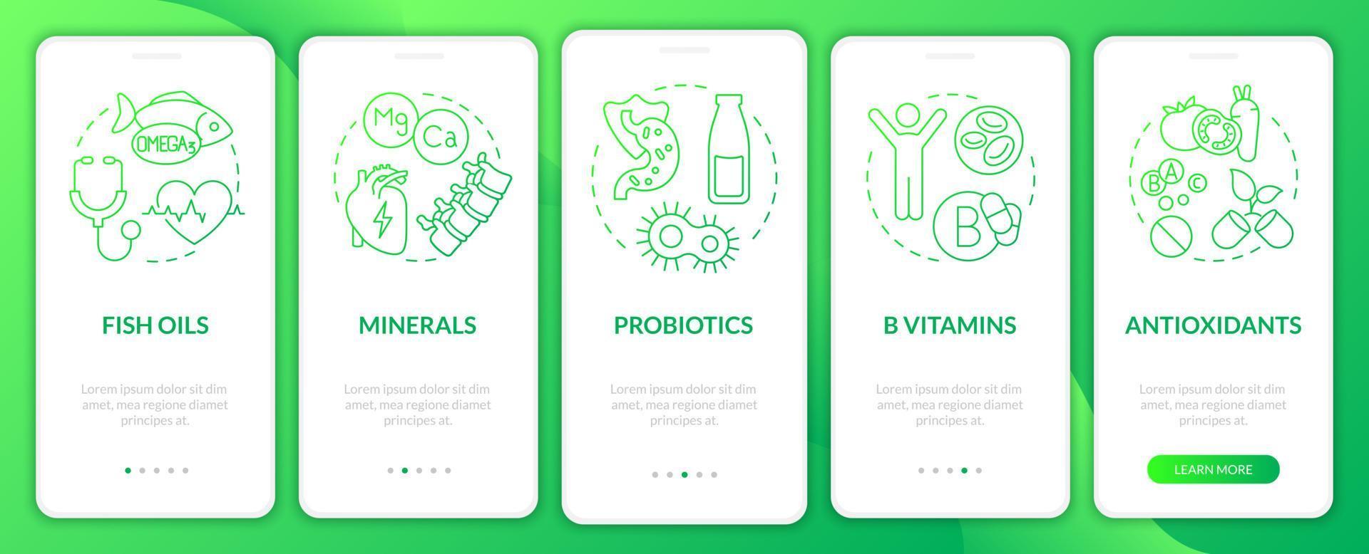 Dietary supplements green gradient onboarding mobile app screen. Meals walkthrough 5 steps graphic instructions pages with linear concepts. UI, UX, GUI template. Myriad Pro-Bold, Regular fonts used Pro Vector