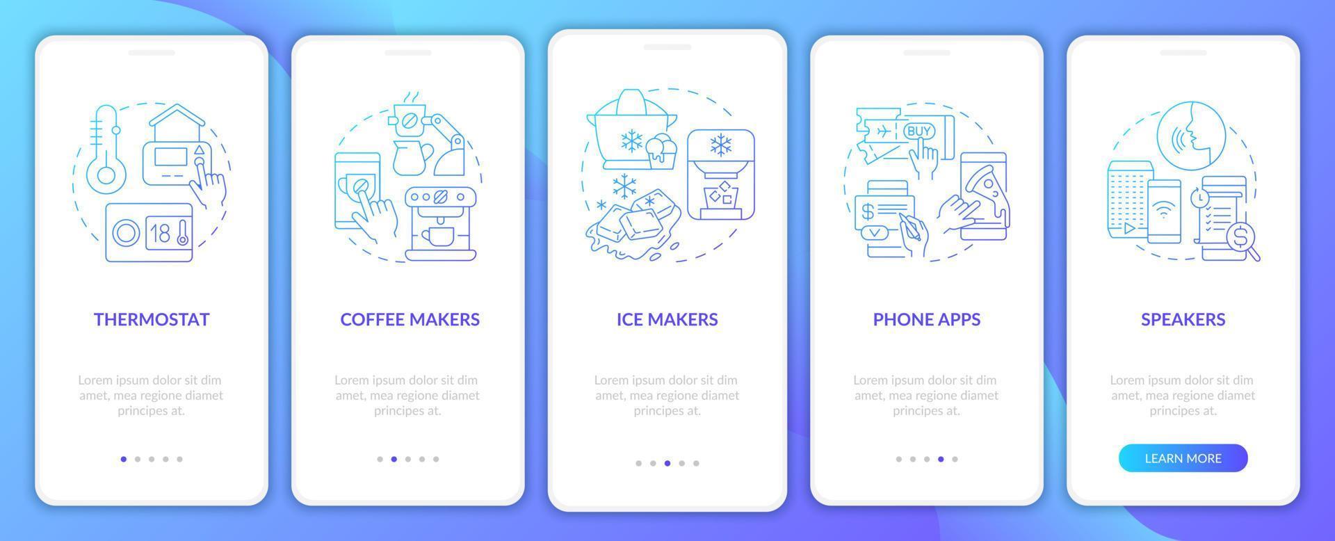 Examples of daily automation blue gradient onboarding mobile app screen. Walkthrough 5 steps graphic instructions pages with linear concepts. UI, UX, GUI template. Myriad Pro-Bold, Regular fonts used Pro Vector