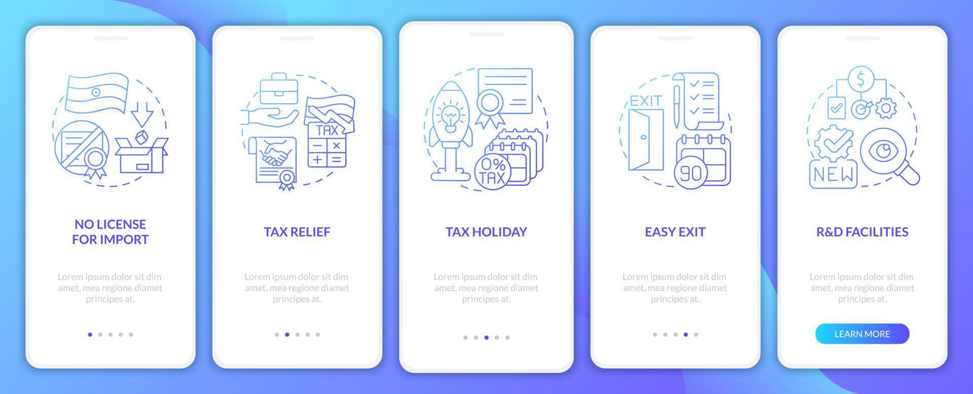 Entrepreneurship incentives blue gradient onboarding mobile app screen. Walkthrough 5 steps graphic instructions pages with linear concepts. UI, UX, GUI template. Myriad Pro-Bold, Regular fonts used Pro Vector