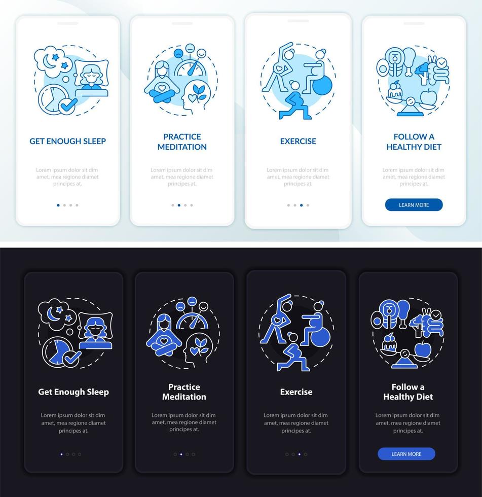 Mental wellbeing onboarding mobile app page screen. Practice meditation walkthrough 4 steps graphic instructions with concepts. UI, UX, GUI vector template with linear night and day mode illustrations Pro Vector