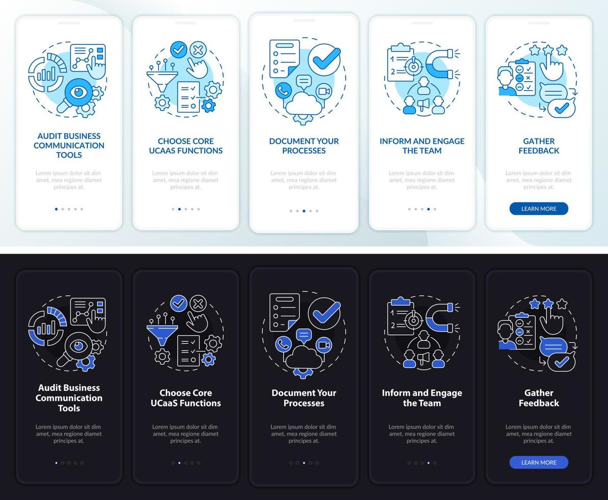 How to move to UCaaS night and day mode onboarding mobile app screen. Walkthrough 5 steps graphic instructions pages with linear concepts. UI, UX, GUI template. Myriad Pro-Bold, Regular fonts used Pro Vector