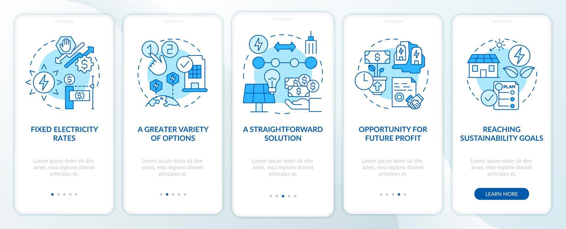 Pros of PPA blue onboarding mobile app screen. Customer benefits walkthrough 5 steps graphic instructions pages with linear concepts. UI, UX, GUI template. Myriad Pro-Bold, Regular fonts used Pro Vector