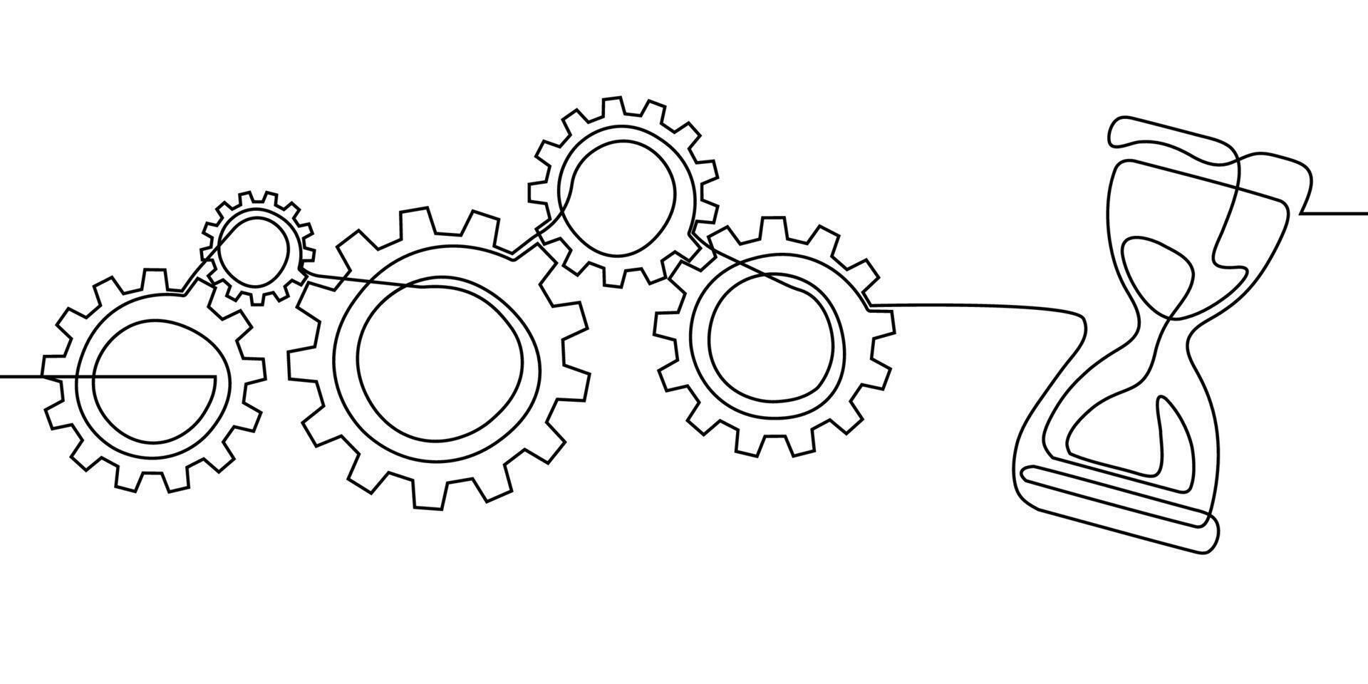Continuous line gear one art cog icon work business factory wheel. Line gear continuous setting outline computer cogwheel technology sketch drawing science stroke machine brain background. Pro Vector