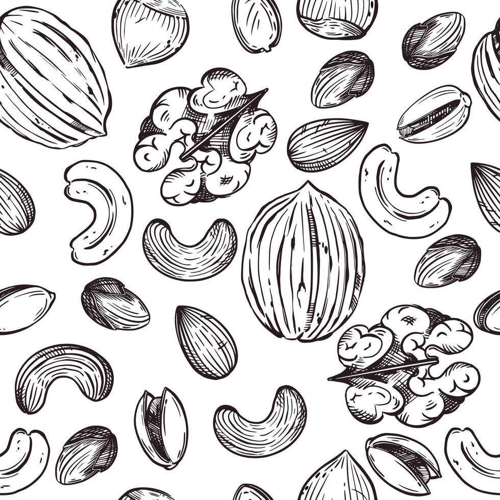 Seamless pattern. Walnuts, hazelnuts, cashews, almonds, and pistachios, all objects are hand-drawn in . For printing on fabric, paper, for food packaging design Pro Vector