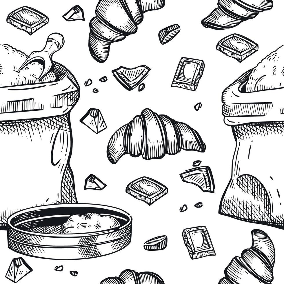 Seamless pattern on the theme of cooking, baking. A bag of flour, a sieve, pieces of chocolate. All objects are hand-drawn with ink. For printing on paper, bakery design Pro Vector