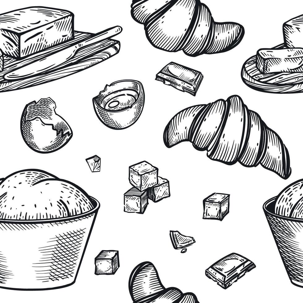 Seamless pattern on the theme of baking. A bowl of dough, croissants, chocolate slices, egg, butter in a butter dish. All objects are hand-drawn with ink. For printing on packaging, paper Pro Vector
