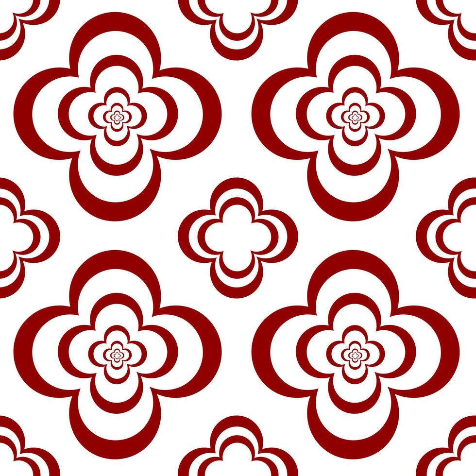A seamless pattern featuring stylized red flowers with layered petals on a white background. The design is symmetrical and repetitive, creating a visually appealing floral motif. Pro Vector