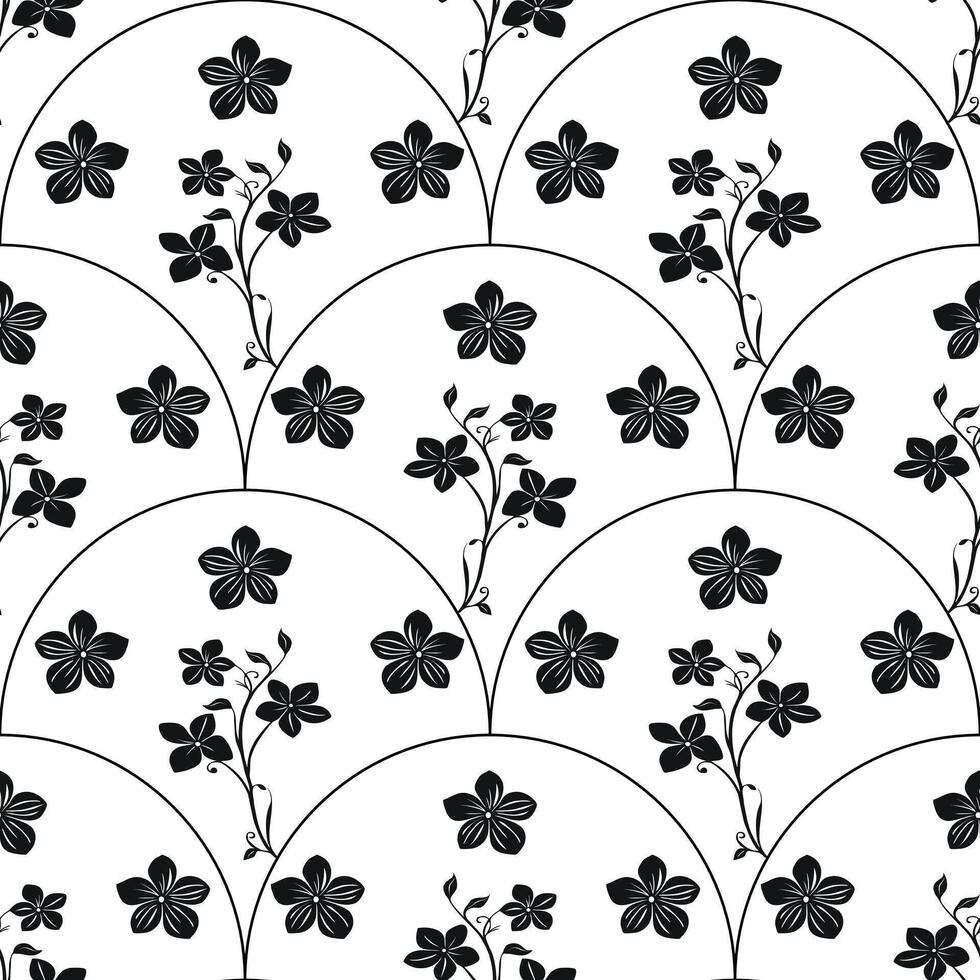 A seamless pattern featuring black floral designs on a white background. The pattern consists of stylized flowers and vines arranged in a reflected arch shape. Pro Vector