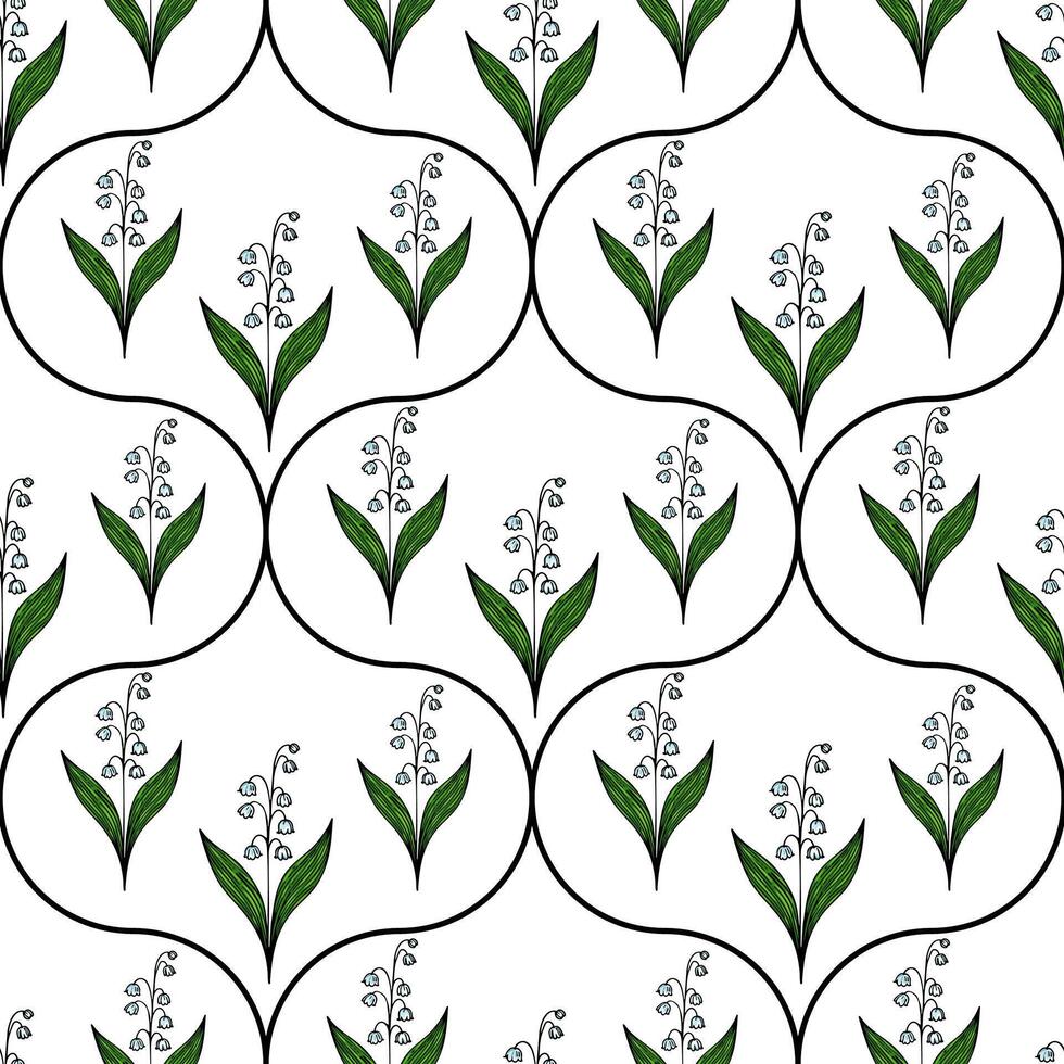A seamless pattern featuring delicate lily of the valley flowers with green leaves, arranged in a repeating circular design on a white background. Pro Vector