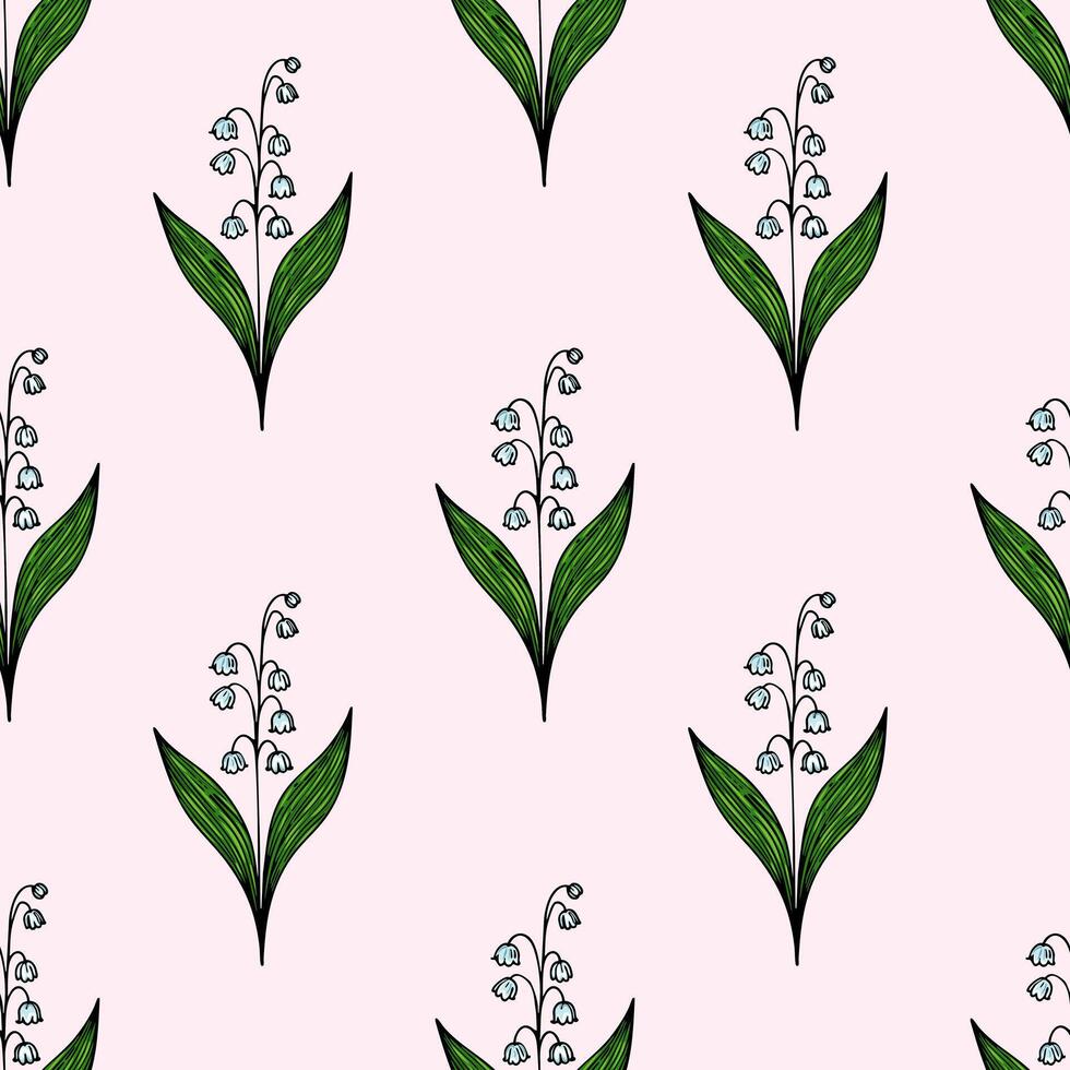 A seamless pattern featuring delicate lily of the valley flowers with green leaves on a soft pink background. Pro Vector