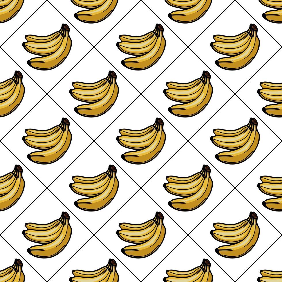 A seamless pattern featuring hand-drawn bananas arranged in a grid on a white background. The bananas are bright yellow with a slight shadow, giving them a playful and vibrant look. Pro Vector