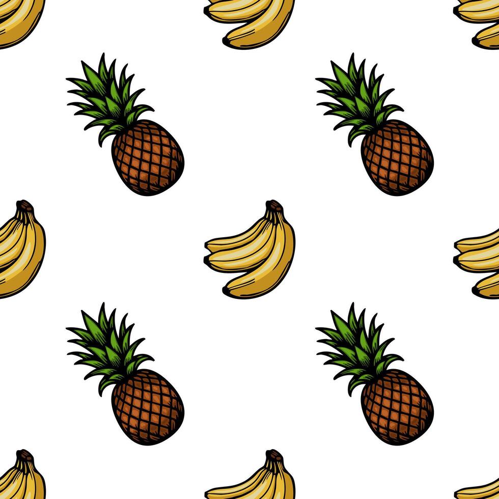 A seamless pattern featuring illustrations of pineapples and bananas on a white background. The design is vibrant and playful, suitable for various applications. Pro Vector