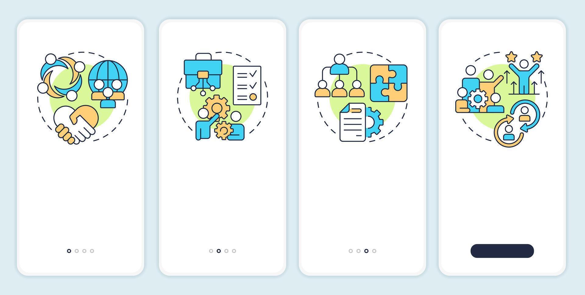 Nadler Tushman congruence framework onboarding mobile app screen. Walkthrough 4 steps editable graphic instructions with linear concepts. UI, UX, GUI Pro Vector