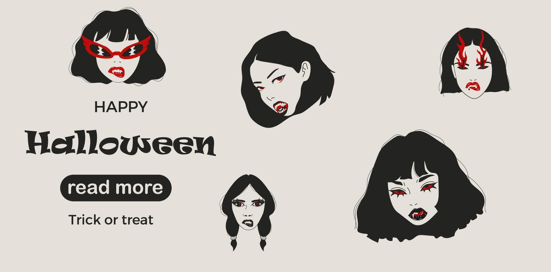 Web page design template. Set of Vampire Girl Featuring Sharp Fangs and Red Eyes Pro Vector