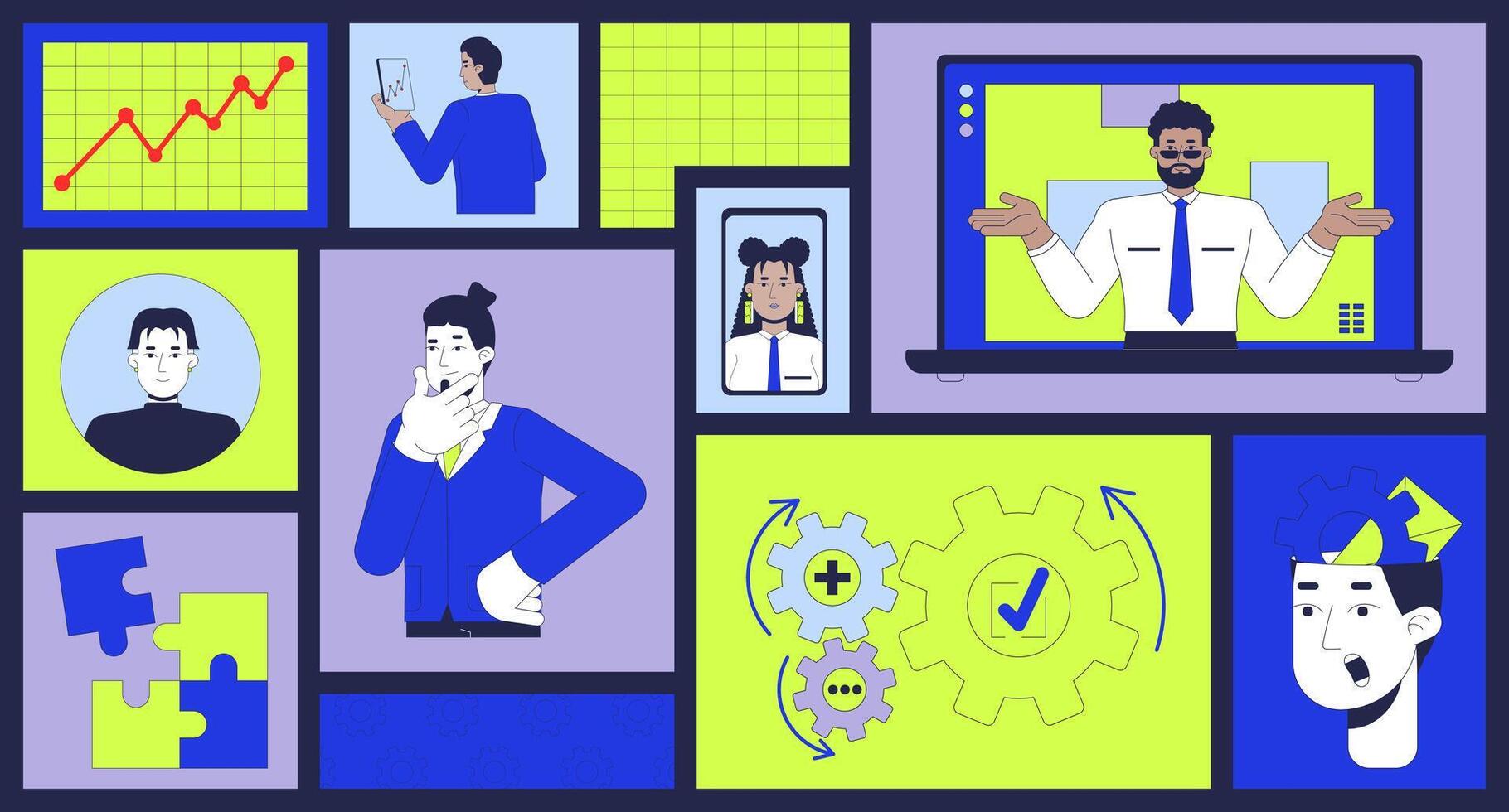 Data efficiency and remote business operations bento grid illustration set. conferencing, gears, charts, puzzle 2D image collage collection. Diverse flat characters moodboard layout Pro Vector